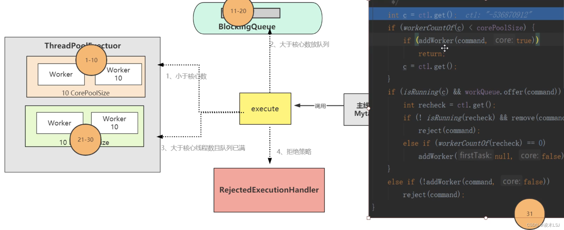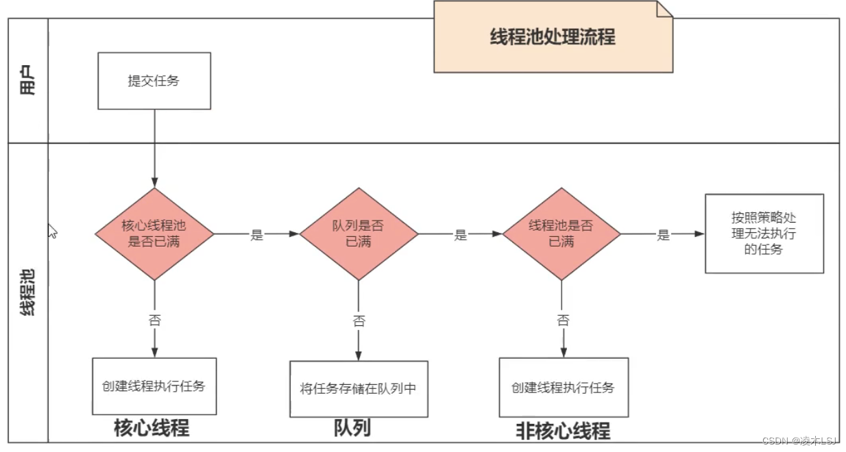 - 非核心线程:线程池中非固定含有的线程数目。如果ThreadPoolExecutor方法中maximumPoolSize参数的值大于corePoolSize则会有非核心线程出现,否则则没有。