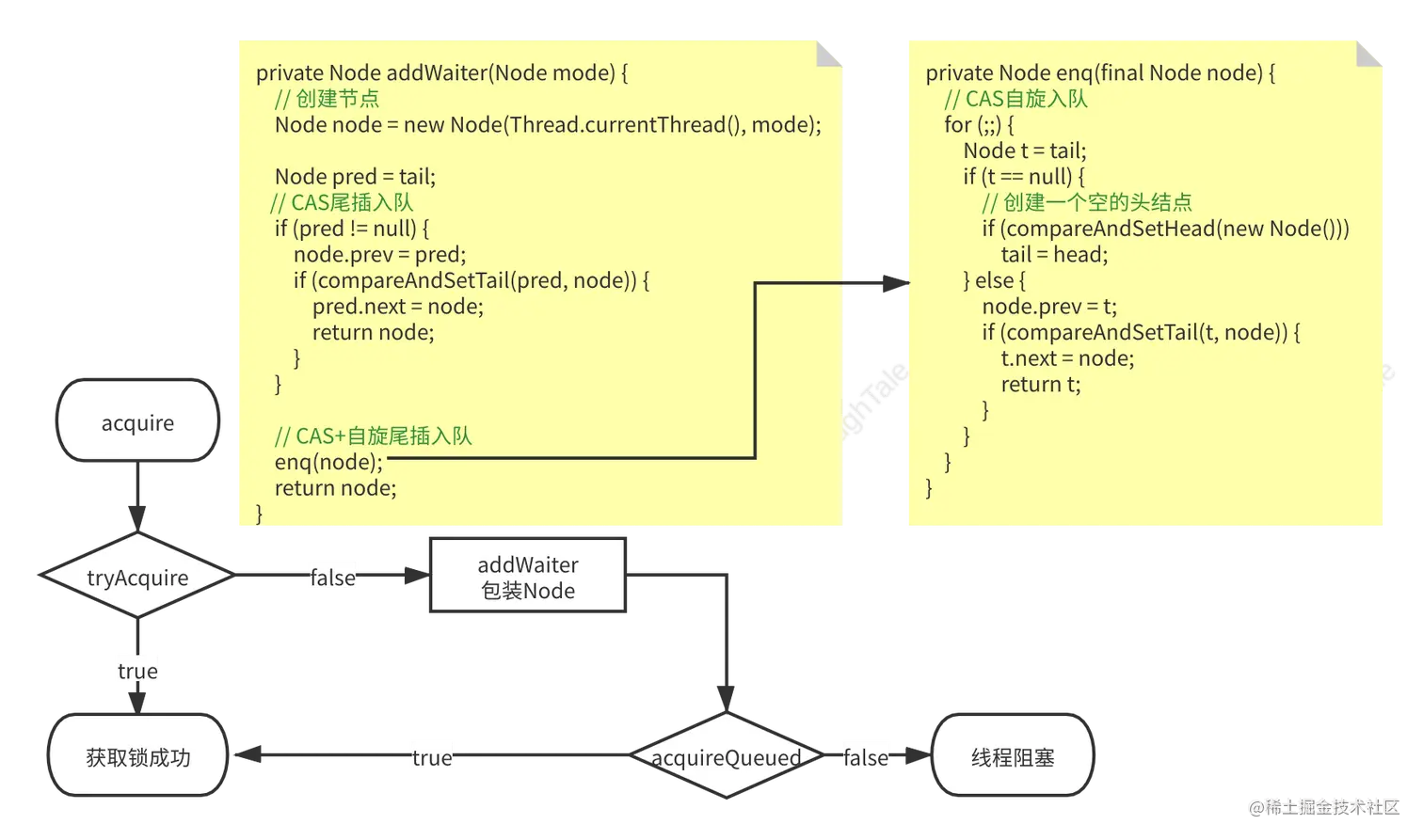 - addWaiter将线程包装为独占节点,尾插式加入到队列中,如队列为空,则会添加一个空的头节点。值得注意的是addWaiter中的enq方法,通过CAS+自旋的方式处理尾节点添加冲突。