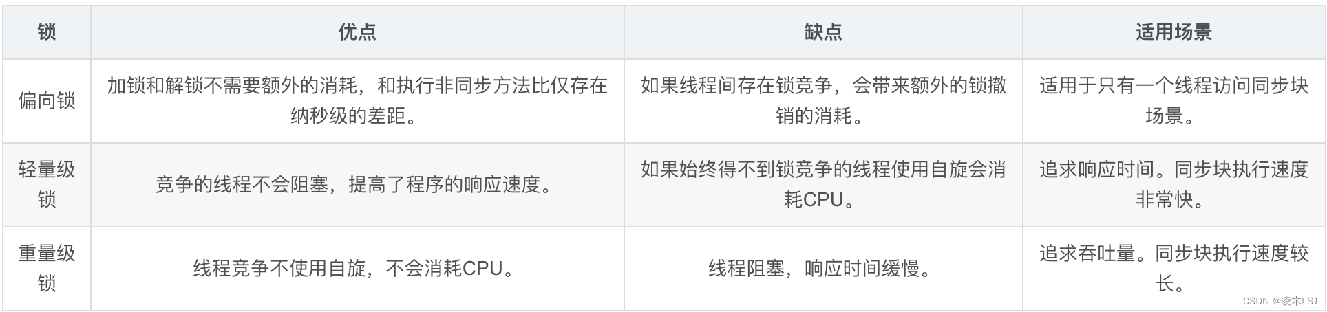 - 以后该线程获取锁的时,判断一下线程 ID 和标志位,就可以直接进入同步块,连 CAS 操作都不需要,这样就省去了大量有关锁申请的操作,从而也就提供程序的性能。