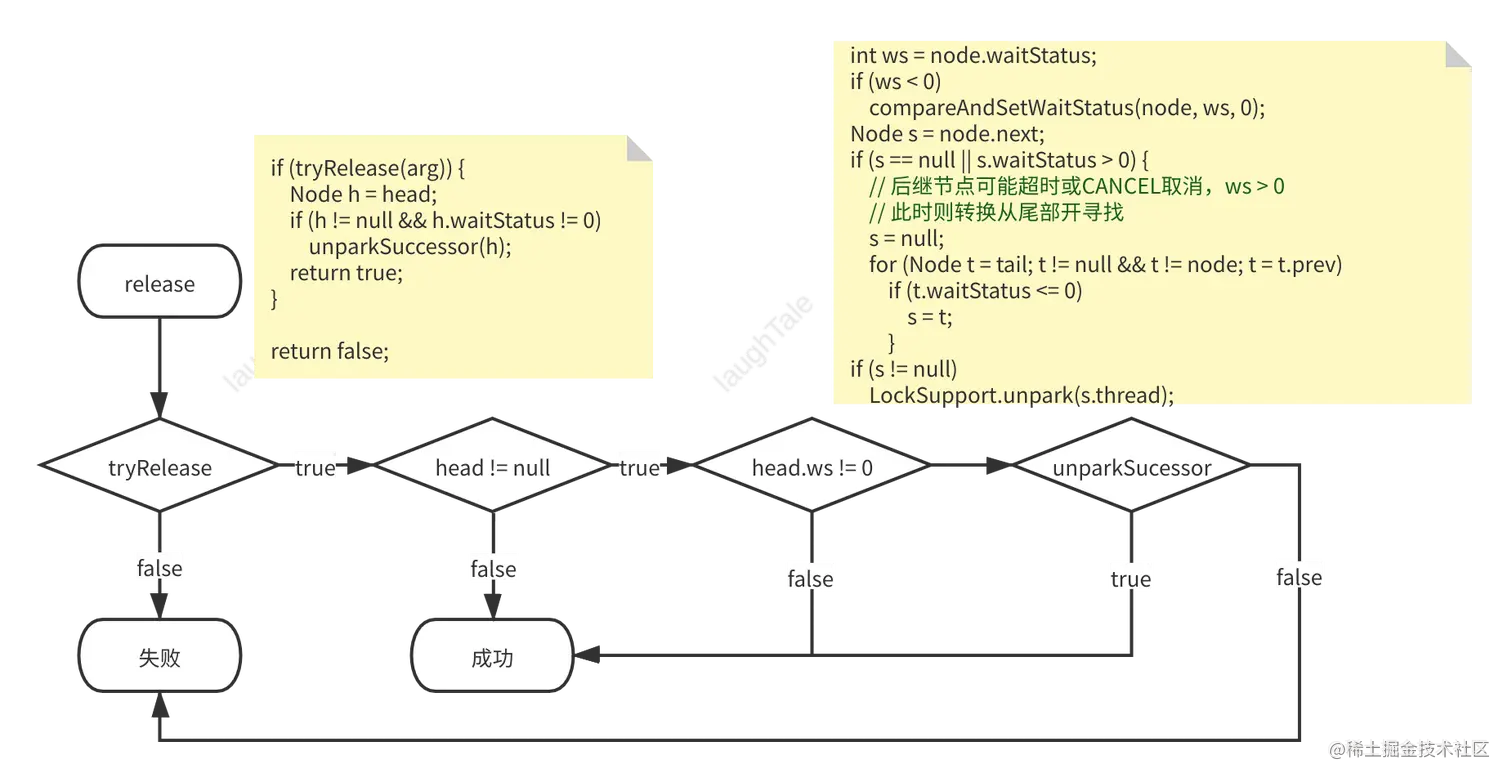 - acquireQueue在线程节点加入队列后判断是否可再次尝试获取资源,如不能获取则将其前驱节点标志为SIGNAL状态(表示其需要被unpark唤醒)后,则通过park进入阻塞状态。