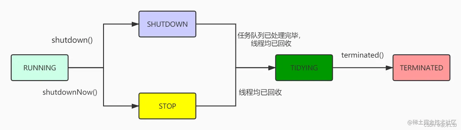 注意: ThreadPoolExecutor 就是通过将一个 32 位的 int 类型变量分割为两段,高 3 位用来表示线程池的当前生命周期状态,低 29 位就拿来表示线程池的当前线程数量,从而做到用一个变量值来维护两份数据,这个变量值就是 ctl。