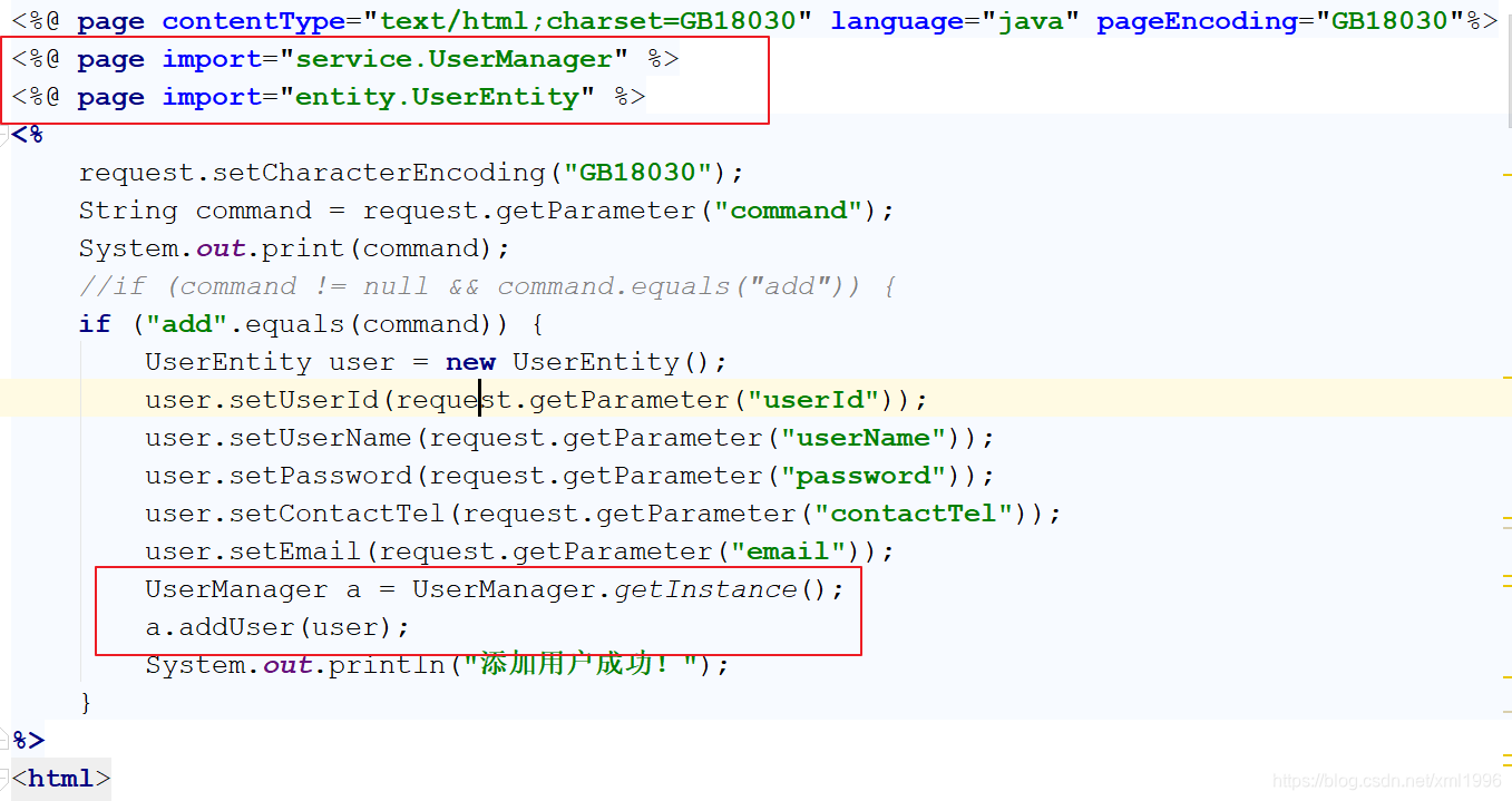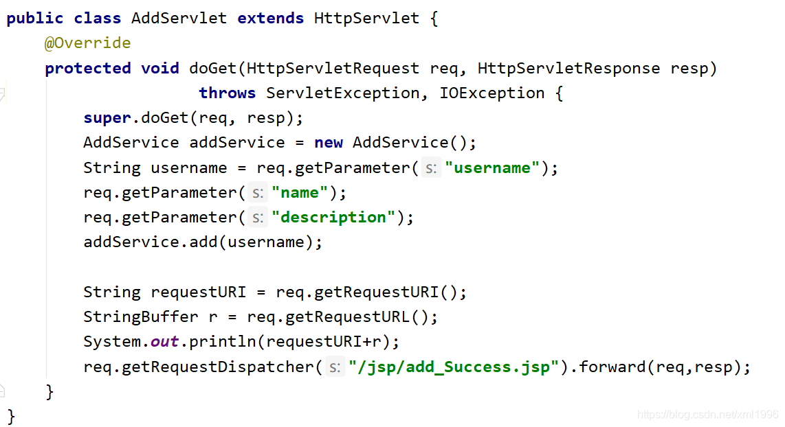 在地址中输入例如: http://localhost:8081/servlet/AddServlet,根据配置文件中的配置,会先调用addServlet,,然后通过Servlet,获取参数,调用业务逻辑层,然后接收返回的结果,跳转到需要的页面,带着数据转发过去。