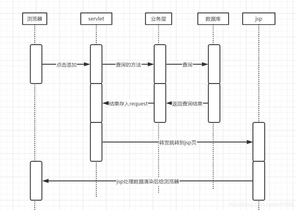 看一下在没有MVC出现之前的典型前后端处理数据库的古老方式:JSP--Service 如图: