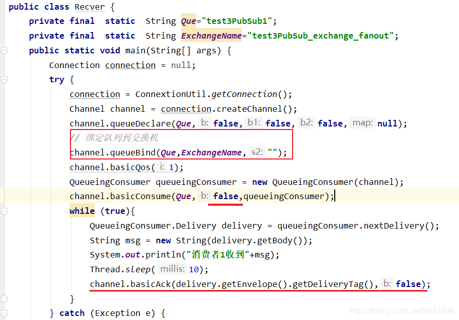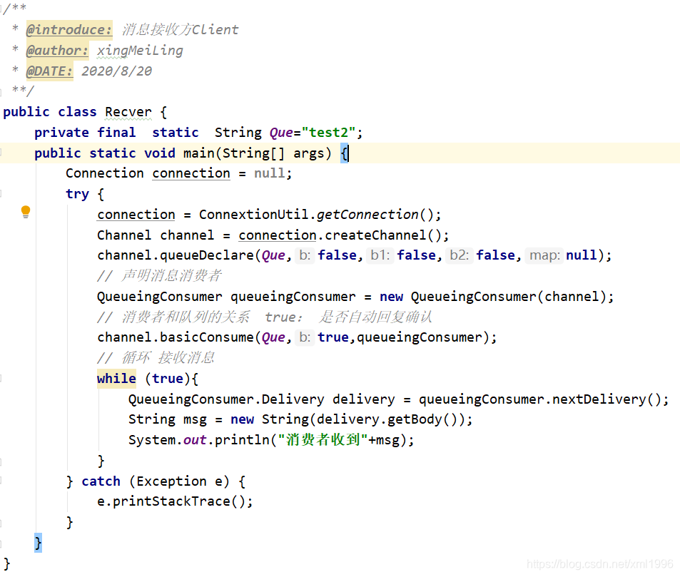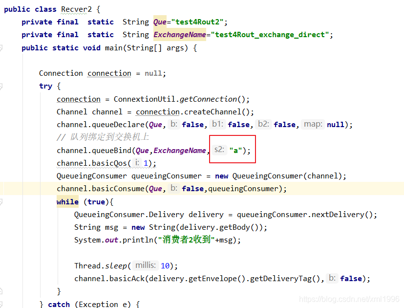 创建连接工厂ConnectionFactory,设置服务地址127.0.0.1,端口号5672,设置用户名、密码、virtual host,从连接工厂中获取连接connection,使用连接创建通道channel,使用通道channel创建队列queue,绑定队列到交换机,设置Qos=1,创建消费者并监听队列,使用手动方式返回完成。可以有多个队列绑定到交换机,但只要绑定key=a的队列key接收到消息,多个消费者进行监听。