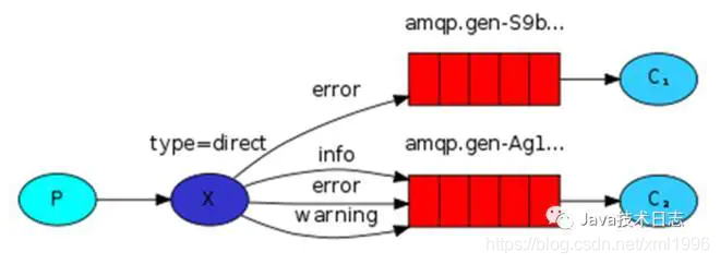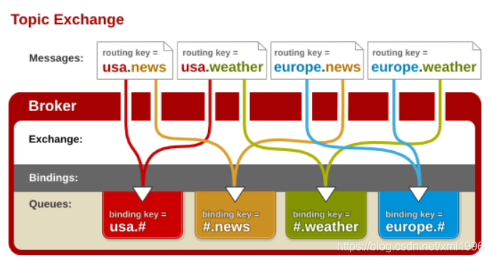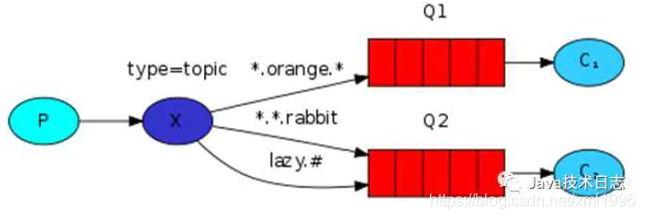 说明:生产者P发送消息到交换机X,type=topic,交换机根据绑定队列的routing key的值进行通配符匹配;