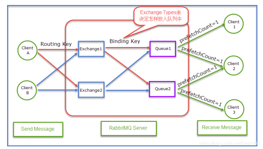 Exchange:交换机,接收生产者发送的消息,并根据 Routing Key ;路由关键字,将消息路由到服务器中的队列Queue。