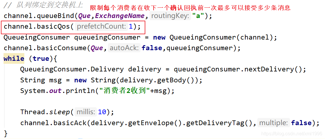 来解决有的消费者处理很快,出现资源空闲的情况,为了能做到能者多劳的情况,设置在一定范围内可以尽量多的处理消息: