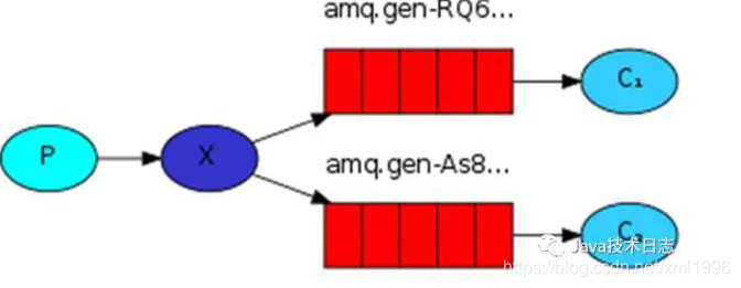 功能:一个生产者发送的消息会被多个消费者获取。一个生产者、一个交换机、多个队列、多个消费者