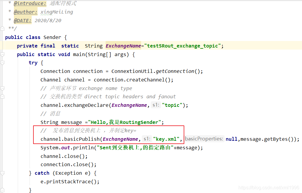 解释一下routingKey 和bindingKey: 如图:key.xml就是RoutingKey,key.*就是BindingKey