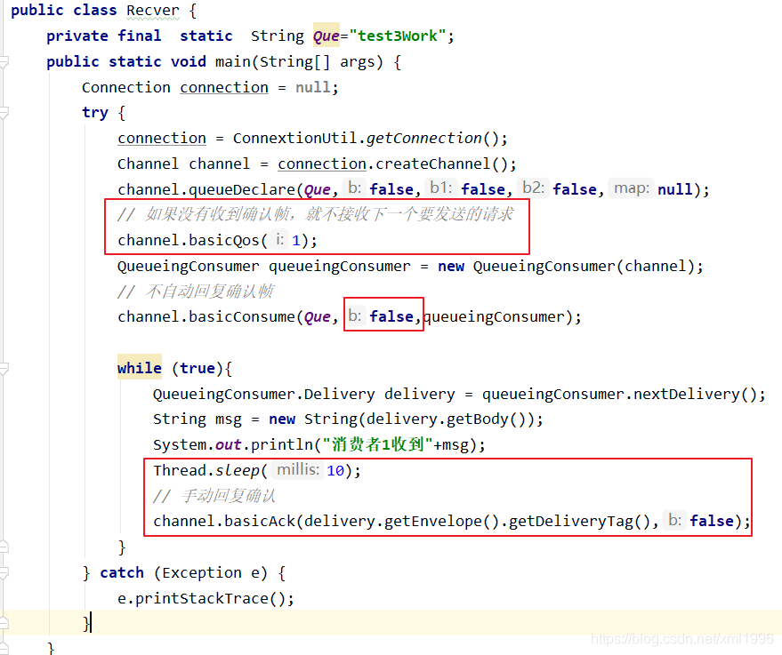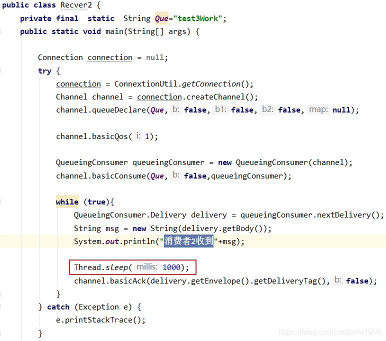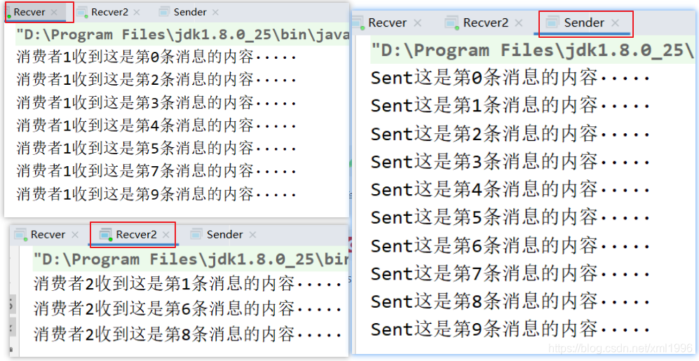创建消费者Recver1并监听队列,获取消息并暂停10ms,另外一个消费者Recver2暂停1000ms,由于消费者1消费速度快,所以2可以执行更多的任务。