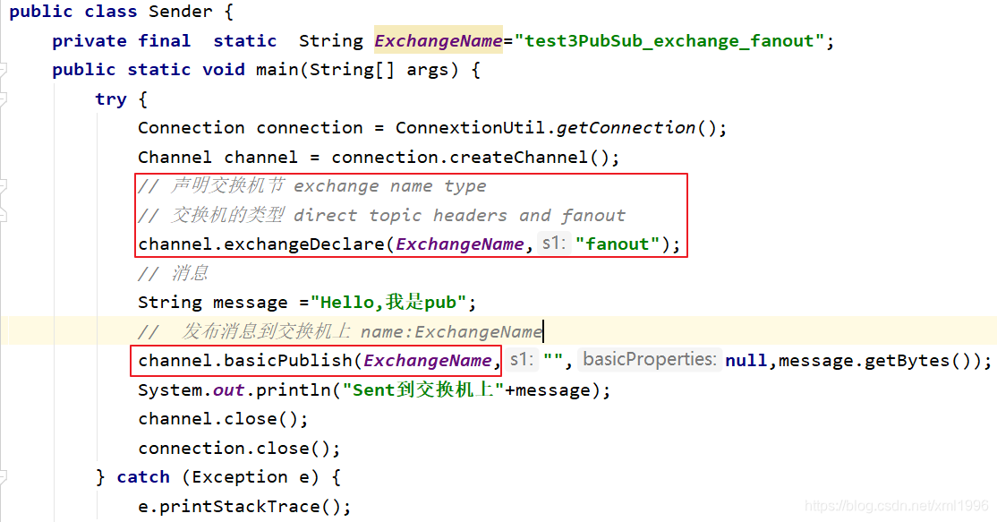 创建连接工厂ConnectionFactory,设置服务地址127.0.0.1,端口号5672,设置用户名、密码、virtual host,从连接工厂中获取连接connection,使用连接创建通道channel,使用通道channel创建队列queue,使用通道channel创建交换机并指定交换机类型为fanout,使用通道向交换机发送消息,关闭通道和连接。