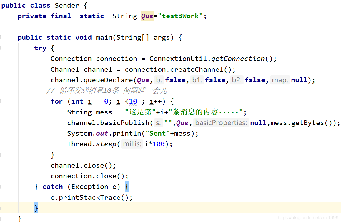 创建连接工厂ConnectionFactory,设置服务地址127.0.0.1,端口号5672,设置用户名、密码、virtual host,从连接工厂中获取连接connection,使用连接创建通道channel,使用通道channel创建队列queue,使用通道channel向队列中发送消息,10条消息之间间隔一定时间,关闭通道和连接。