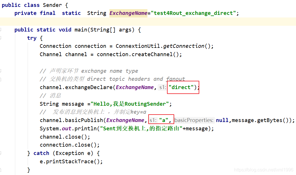创建连接工厂ConnectionFactory,设置服务地址127.0.0.1,端口号5672,设置用户名、密码、virtual host,从连接工厂中获取连接connection,使用连接创建通道channel,使用通道channel创建队列queue,使用通道channel创建交换机并指定交换机类型为direct,使用通道向交换机发送消息并指定key=a,关闭通道和连接。