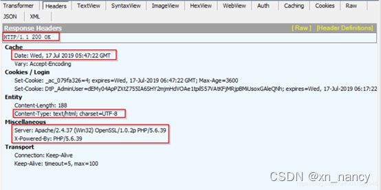 响应头字段:时间日期格式:Date: Wed, 17 Jul 2019 05:47:22 GMT;Server:看出来服务端服务器是Apache,语言是PHP;其他的几个字段和请求参数是对应的,是通用的字段。