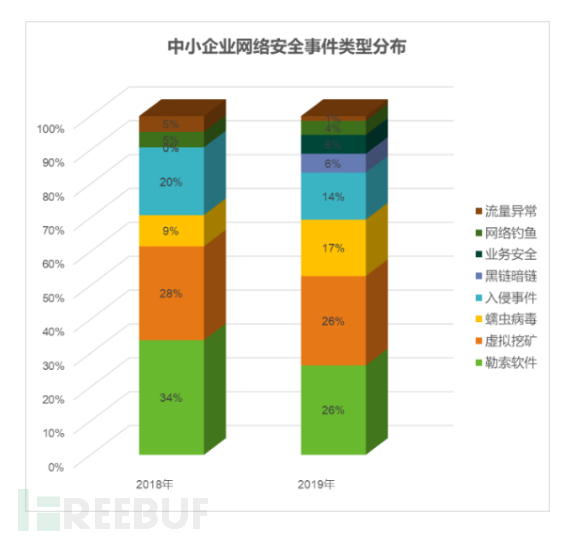 。据统计,2019年中小企业遭遇的网络安全事件中,26%为勒索软件、26%为虚拟挖矿、17%为蠕虫病毒、14%为入侵事件。由于自身人力和应急响应机制不健全等原因,中小企业更倾向于借助保险工具转移部分网络安全风险。