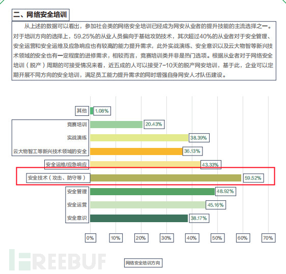 。而在培训方向选择上,59.25%的从业人员偏向于基础攻防技术,也就是网络安全行业里热门的渗透工程师岗位。