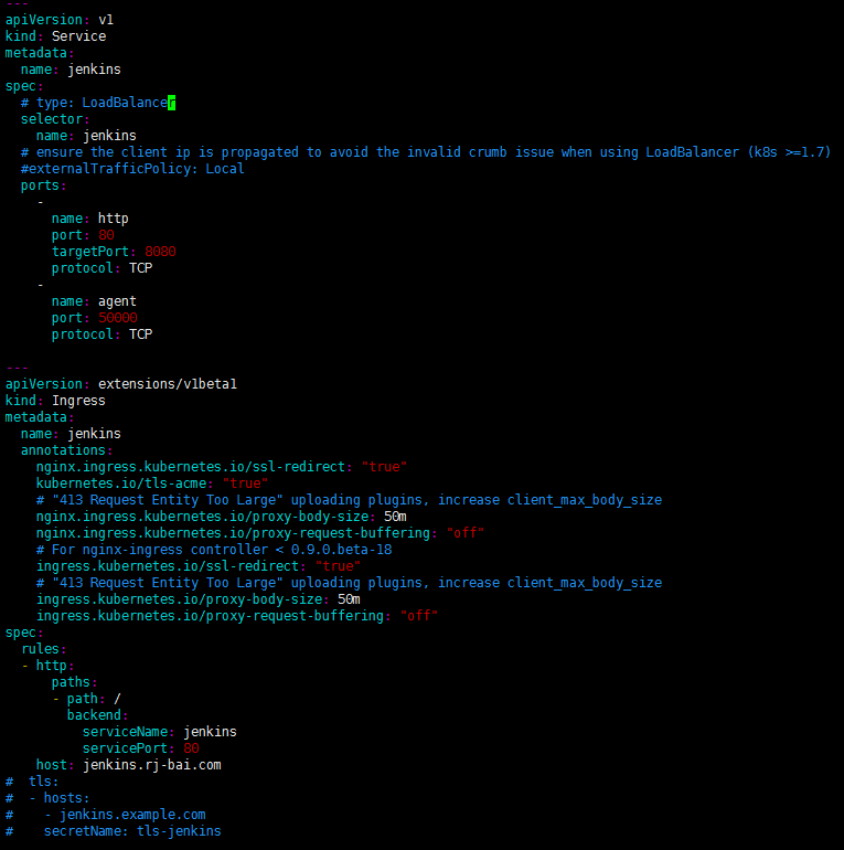 可以看到有两个文件,service-account.yml 文件是创建 RBAC 授权相关的东西,这个不要动,主要看一下 jenkins.yml。