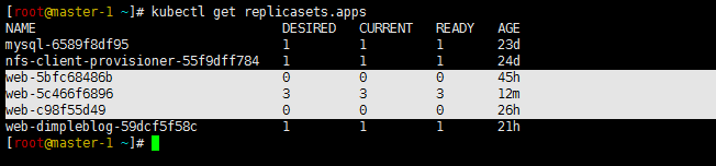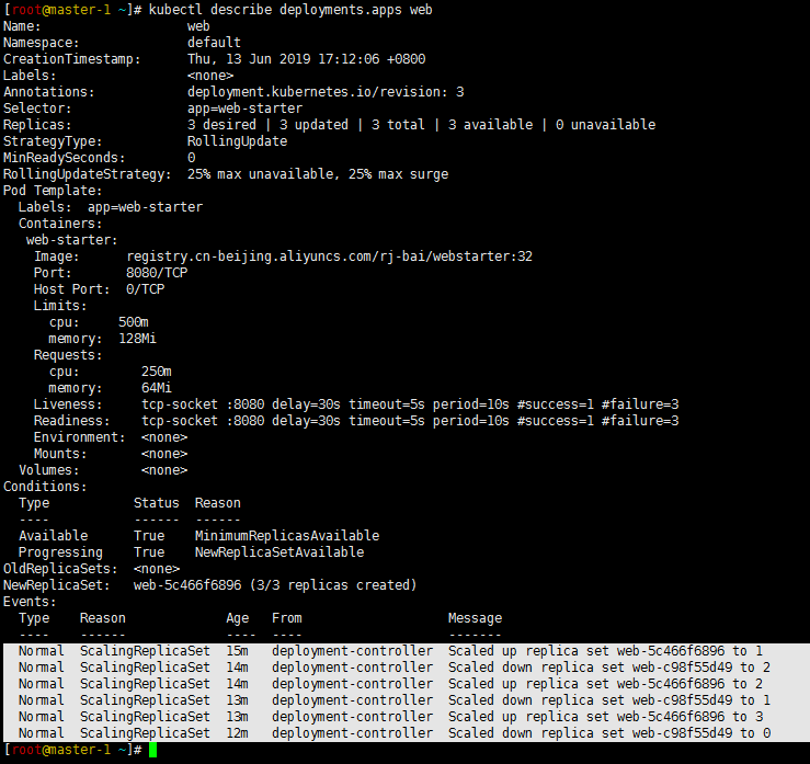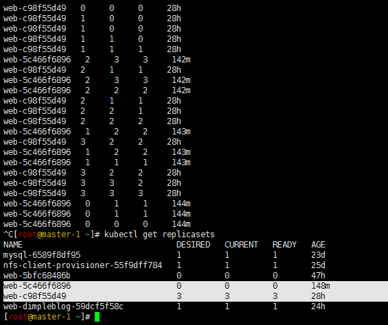 可以看到在触发滚动更新的时候新创建了一个名为 web-5c466f6896 的 replicasets,设置它的副本数为 1,这就是用来跑新版本的,这个正常启动之后下一步操作是把名为 web-c98f55d49 的 replicasets 副本调整成了 2,这是旧的 replicasets,所以这时候就是有两个旧版本一个新版本在跑,注意这不是同时进行的,是新的启动成功之后才会去停旧的,如果新的启动失败了,滚动更新就会暂停,不会影响旧的 replicasets,最终结果就是新的 web-5c466f6896 副本数设置为 3,旧的 web-c98f55d49 设置成 0,下面看一下 ReplicaSet 就明白了。