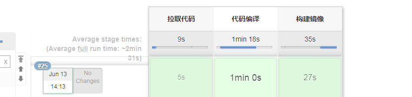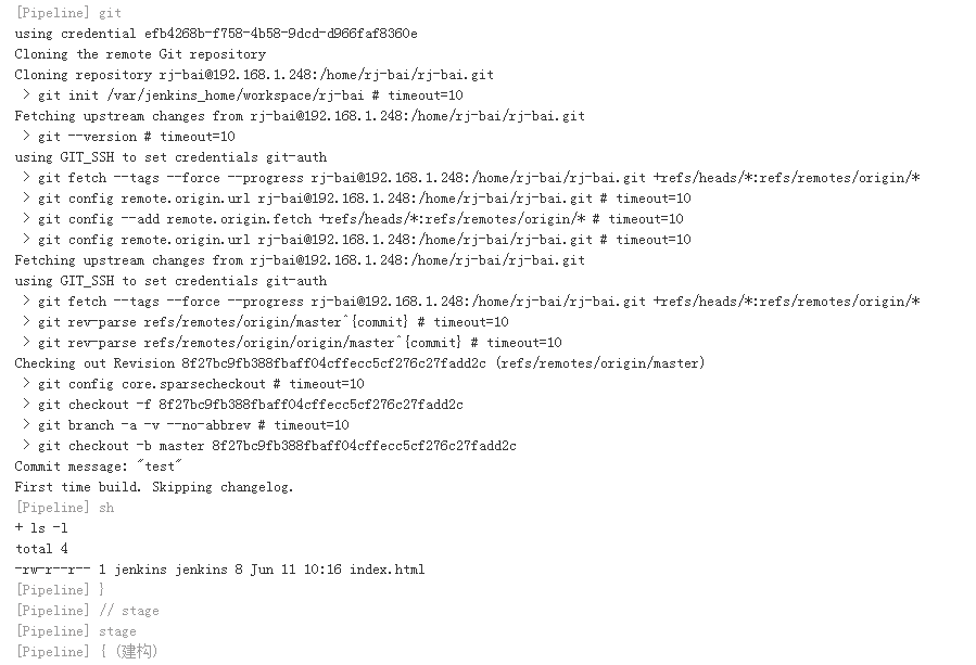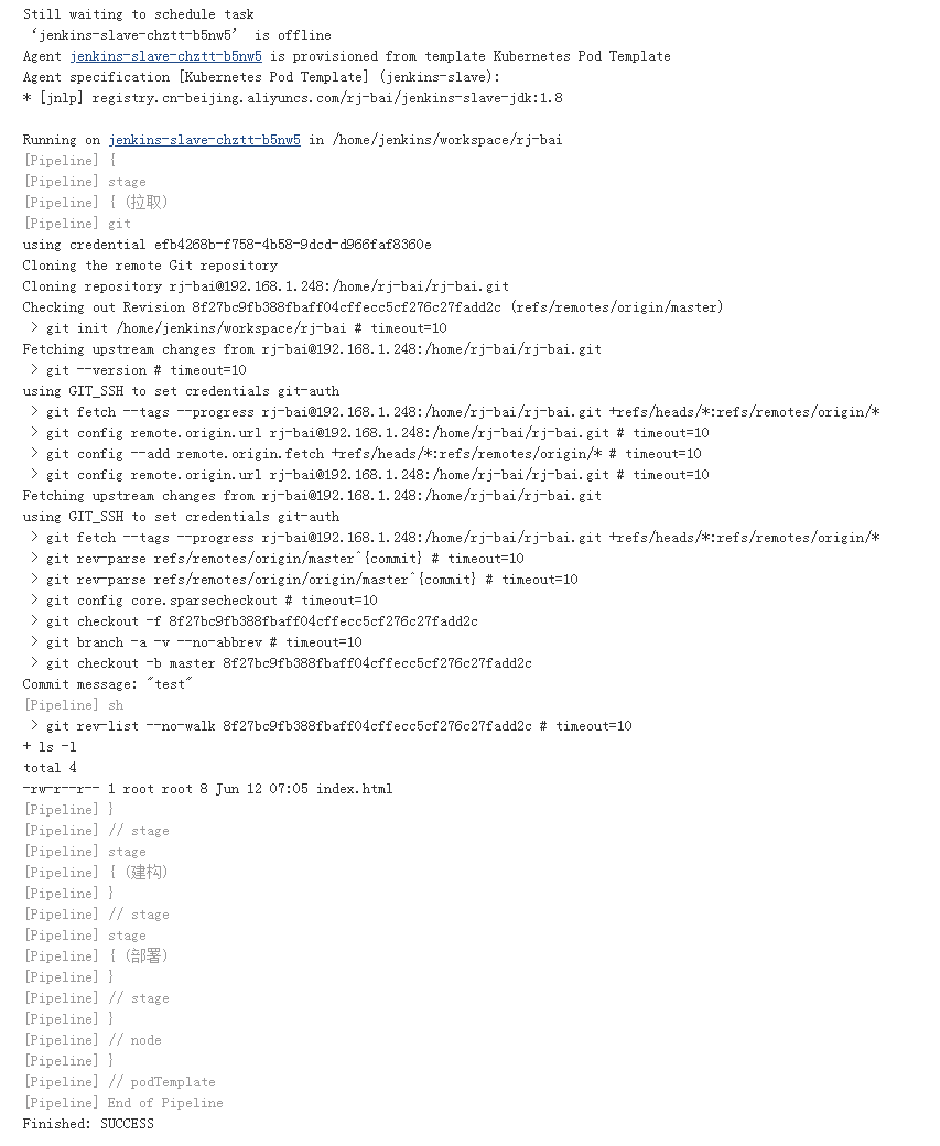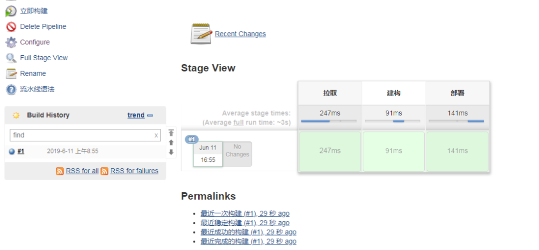 Branches to build 里指定的是要在哪个分支去拉取 Jenkinsfile,我们这里指定 master 就可以了,这样配置后脚本就不用写在 jenkins 里了,保存开始构建吧,这次是一次就成功了,