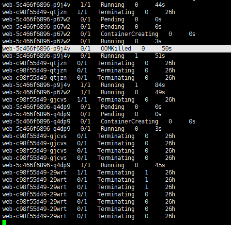 我直接用 jenkins 去更新一下最开始的那个 java-demo 了,因为他的副本数是三个,看着会比较明显,等待更新完成,因为有健康检查了,更新会比较慢撒,更新时候有一个居然被 OOMKilled 了,看到这个错就是内存占用超了我的资源限制,所以就被杀了,所以在做资源限制的时候也要慎重,但这东西还不能不做,不做的话可能会给你的宿主机带来麻烦,现在已经更新完了。