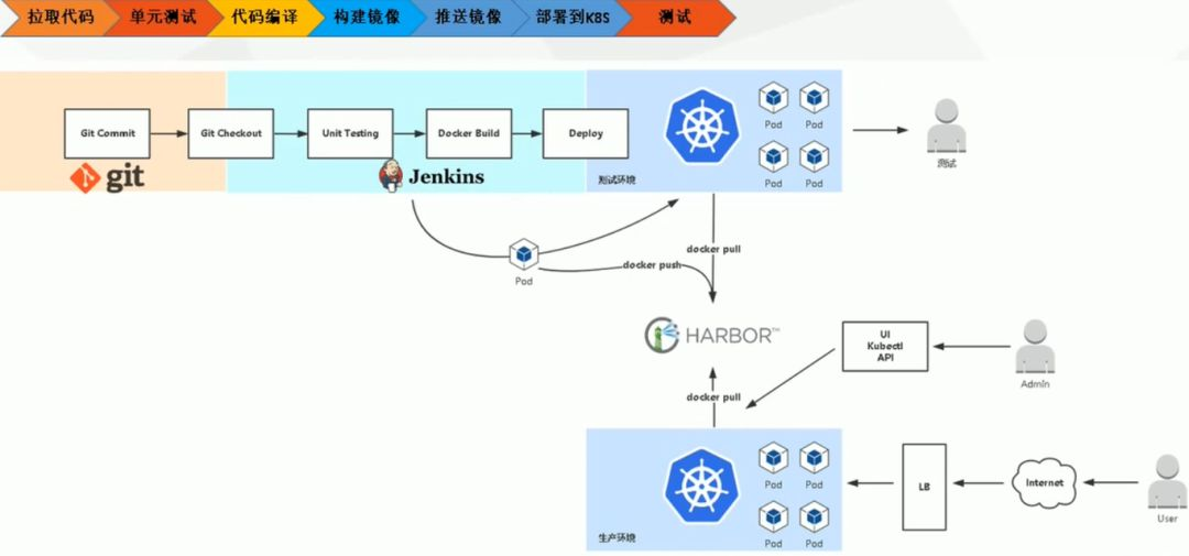 都有个持续,也就是说在不断重复做这件事情,说白了这东西最终的目的就是将项目更有效的部署 / 更新,他的流程大概是这样,以 java 为例,开发提交代码到版本仓库后,通过 jenkins 这个持续集成的软件进行代码的拉取、单元测试、代码的编译、和镜像的构建,一会会用到 jenkins 的 master-slave 架构,slave 可以分担 master 的任务,一会部署的 jenkins 也是在 k8s 集群中,就是一个 pod,所以自动添加的 slave 节点就是一个 pod,有任务触发时,jenkins 会自动创建一个 pod 来作为他的 slave,这个 slave 会去完成代码的拉取、测试、编译、构建镜像、推送镜像到仓库,推到镜像仓库后就可以部署在你需要的地方了,部署完之后通过 ingress 或是 NodePort 发布你的应用,发布之后就可以访问了撒,流程图如下。