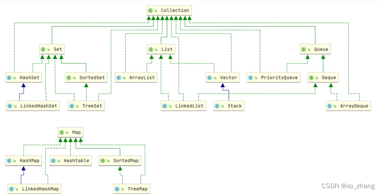Java 集合, 也叫作容器,主要是由两大接口派生而来:一个是 Collection接口,主要用于存放单一元素;另一个是 Map 接口,主要用于存放键值对。对于Collection 接口,下面又有三个主要的子接口:List、Set 和 Queue。