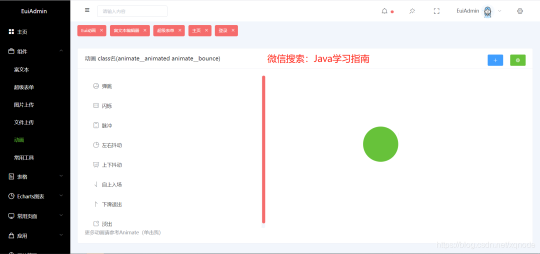 Animate动画助力EuiAdmin成长,可以直接将需要的动画进行选择将"动画 class名"的内容放到需要的class中便可以实现动画