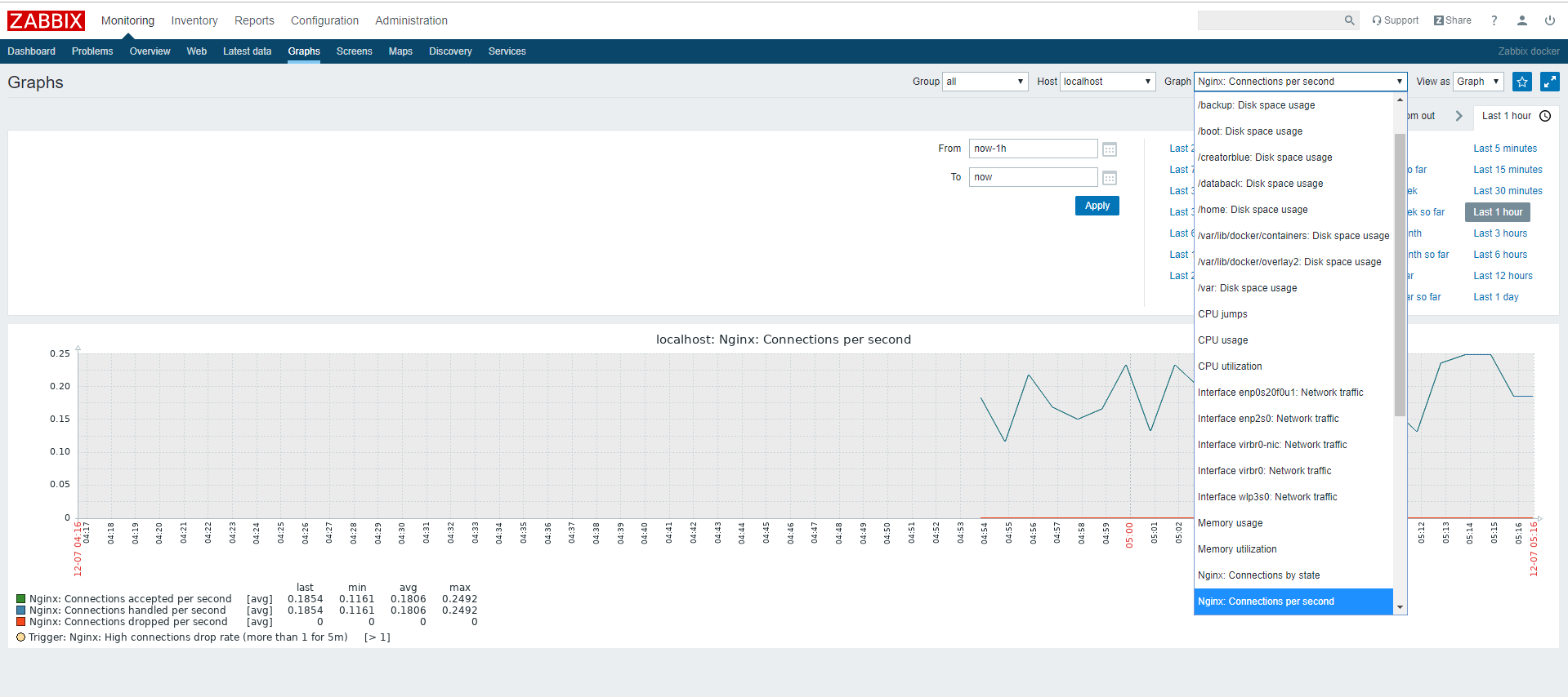 稍等片刻nginx的监控数据就可以上报到中控台,在菜单[Monitoring –> Graphs]界面中可以看到渲染出来的图表了