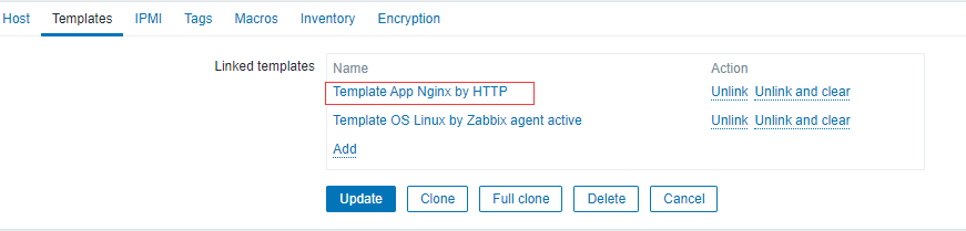 在中控台中菜单[Configuration –> Hosts]界面对指定host添加nginx监控模版,如下图所示: