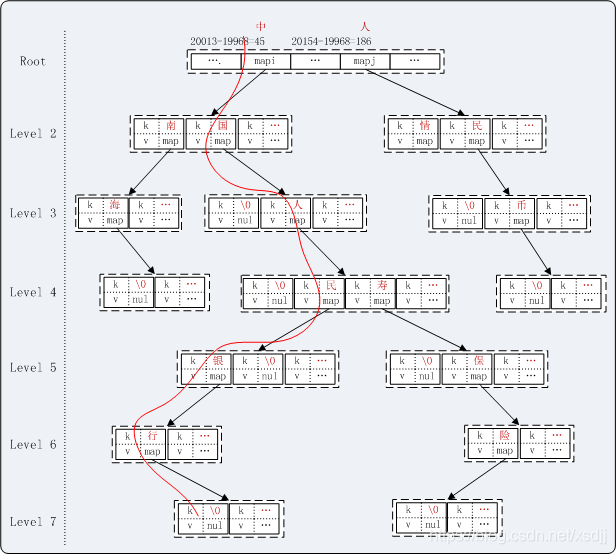 采用基本容器HashMap实现的一种变种字典树(Trie)结构。其基本的思想如图。