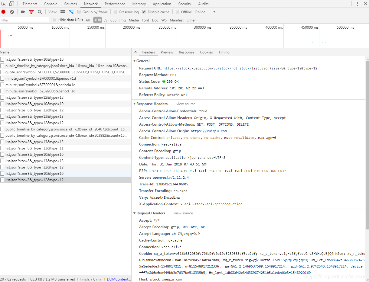打开Ajax的XHR过滤器,然后在热股榜里一直点“沪深”,“港股或”美股”,就可以看到,会不断有Ajax请求发出。
