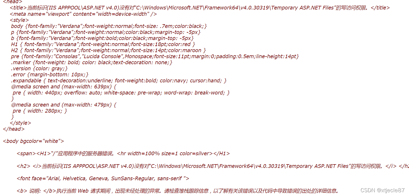 WEB服务在录入数据时显示,当前标识 (IIS APPPOOL.NET v4.5) 没有对”C:\Windows\Microsoft.NET\Framework\v4.0.30319\Temporary ASP.NET Files” 的写访问权限。其中的标识 “.NET v4.5” 是指你的应用程序池,所以每个人可能不一样;后面的路径也可能不一样,比如不是 “Framework” 而是 “Framework64” 之类的。