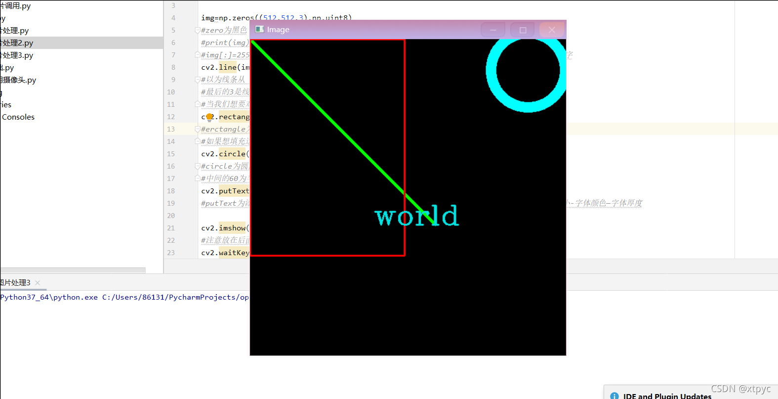 import cv2 import numpy as np img=np.zeros((512,512,3),np.uint8) #zero为黑色 #print(img) #img[:]=255,0,0 ,可以修改图片颜色,此时为全部修改,要想部分修改可以在前面的方括号中填下数字 cv2.line(img,(0,0),(300,300),(0,255,0),3) #以为线条从(0,0)出发到(300,300),(0,255,0)为最标准的绿色,想要其他绿可以更改数值 #最后的3是线条的厚度 #当我们想要对角线时可将(300,300)变成(img.shape[1],img.shape[0]) cv2.rectangle(img,(0,0),(250,350),(0,0,255),2) #erctangle为矩形 #如果想填充这个矩形可以将末尾的2替换成 cv2.FILLED(务必大写) cv2.circle(img,(450,50),60,(255,255,0),15) #circle为圆圈 #中间的60为半径 cv2.putText(img,"world",(200,300),cv2.FONT_HERSHEY_COMPLEX,1.5,(225,225,1),2) #putText为添加文本,添加文本的内容-添加文本位置-字体(cv2.FONT_HERSHEY_COMPLEX)-字体大小-字体颜色—字体厚度 cv2.imshow("Image",img) #注意放在后面 cv2.waitKey(0) #放在最后
