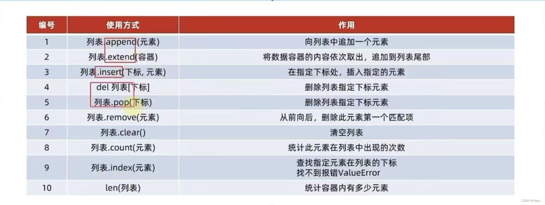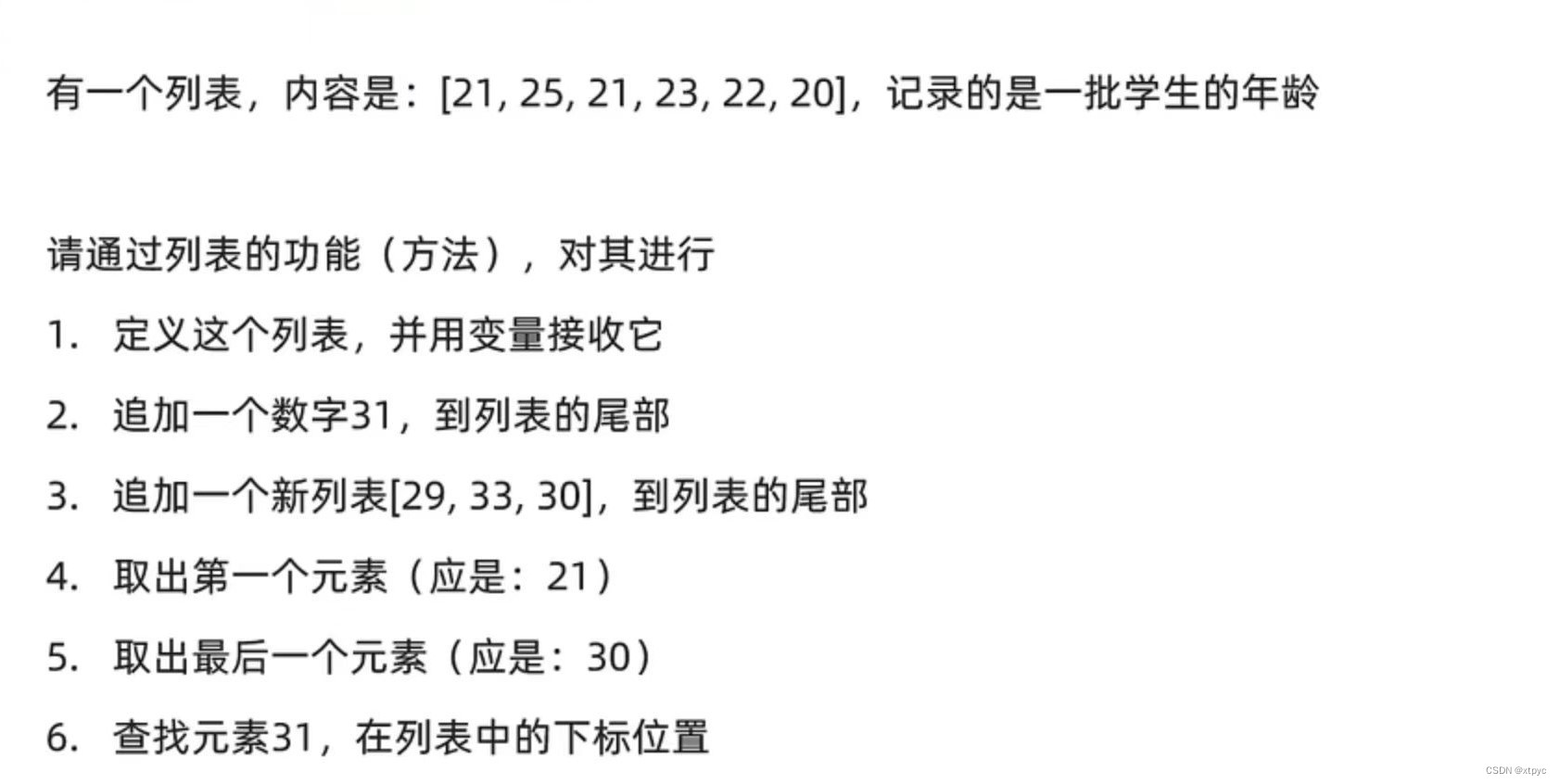 age = [21,25,21,23,22,20] #追加31到列表末尾 age.append(31) print(age) #追加新列表到列表尾部 age1 = [29,33,30] age.extend(age1) print(age) #取出第一个元素 age.pop(0) print(age) #取出最后一个元素 del age[7] print(age) #查看31在列表中的下表位置 index = age.index(31) print(index)