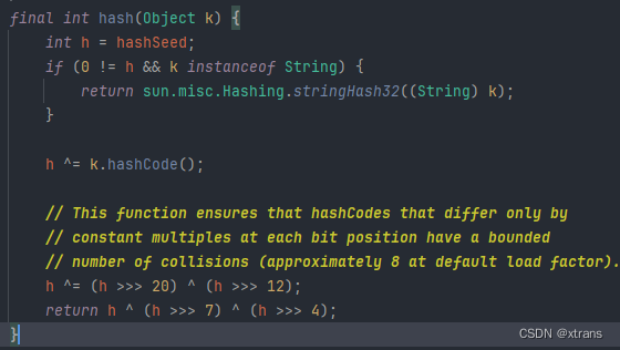 先取得key的hashCode,再经过4次异或得到最后hash值