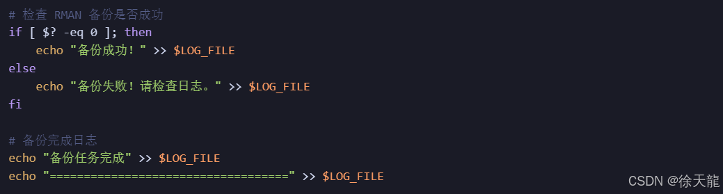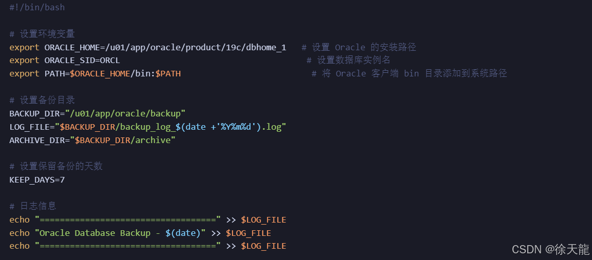 这个脚本为 Oracle 数据库设置了一个自动备份方案,并且通过 RMAN 工具来执行备份和清理工作。你可以根据自己的需求调整备份策略和存储路径。结合 cron 定时任务,你可以实现完全自动化的备份操作,确保数据库的安全性。