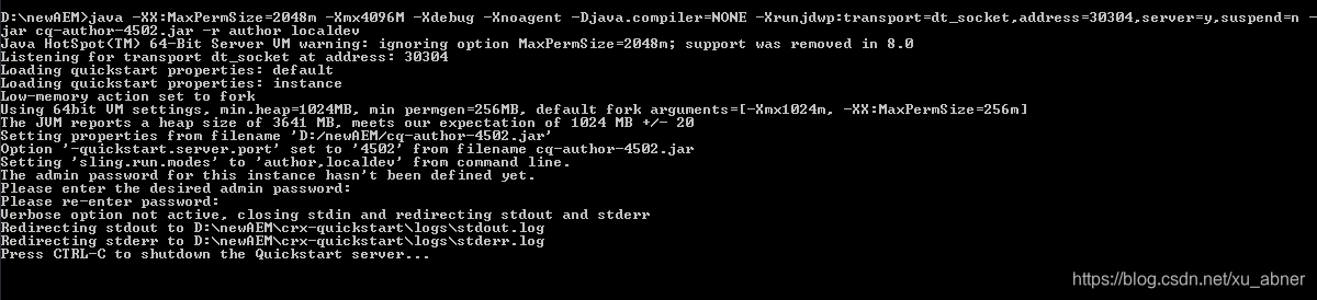 startupAuthor.bat文件内容:java -XX:MaxPermSize=2048m -Xmx4096M -Xdebug -Xnoagent -Djava.compiler=NONE -Xrunjdwp:transport=dt_socket,address=30304,server=y,suspend=n -jar cq-author-4502.jar -r author localdev