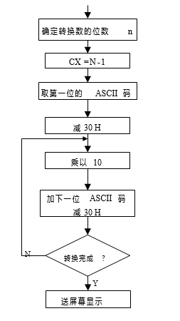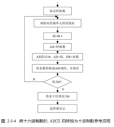 本实验要求将缓冲区中的一个五位十进制数 00012 的 ASCII 码转换成二进制数,并将转换结果显示在屏幕上。转换过程的参考流程如图 2-3-2 所示,根据流程图编写程序代码。