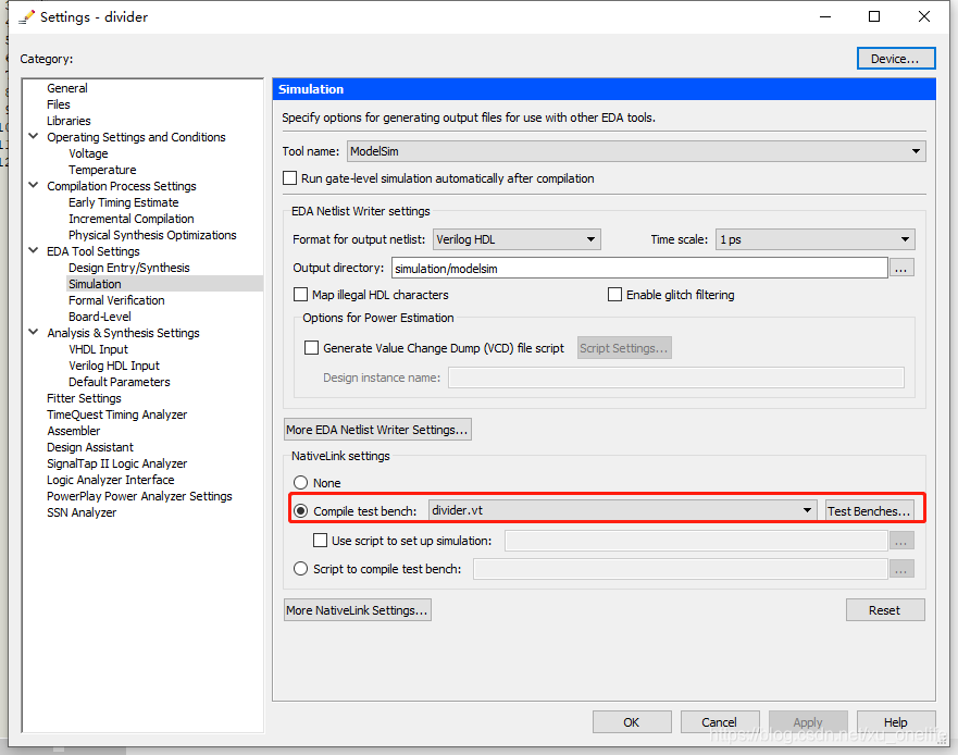 在simulation里面Tool name:选择Modelsim;然后选择红色框地方进入Test Benches进行具体设置。