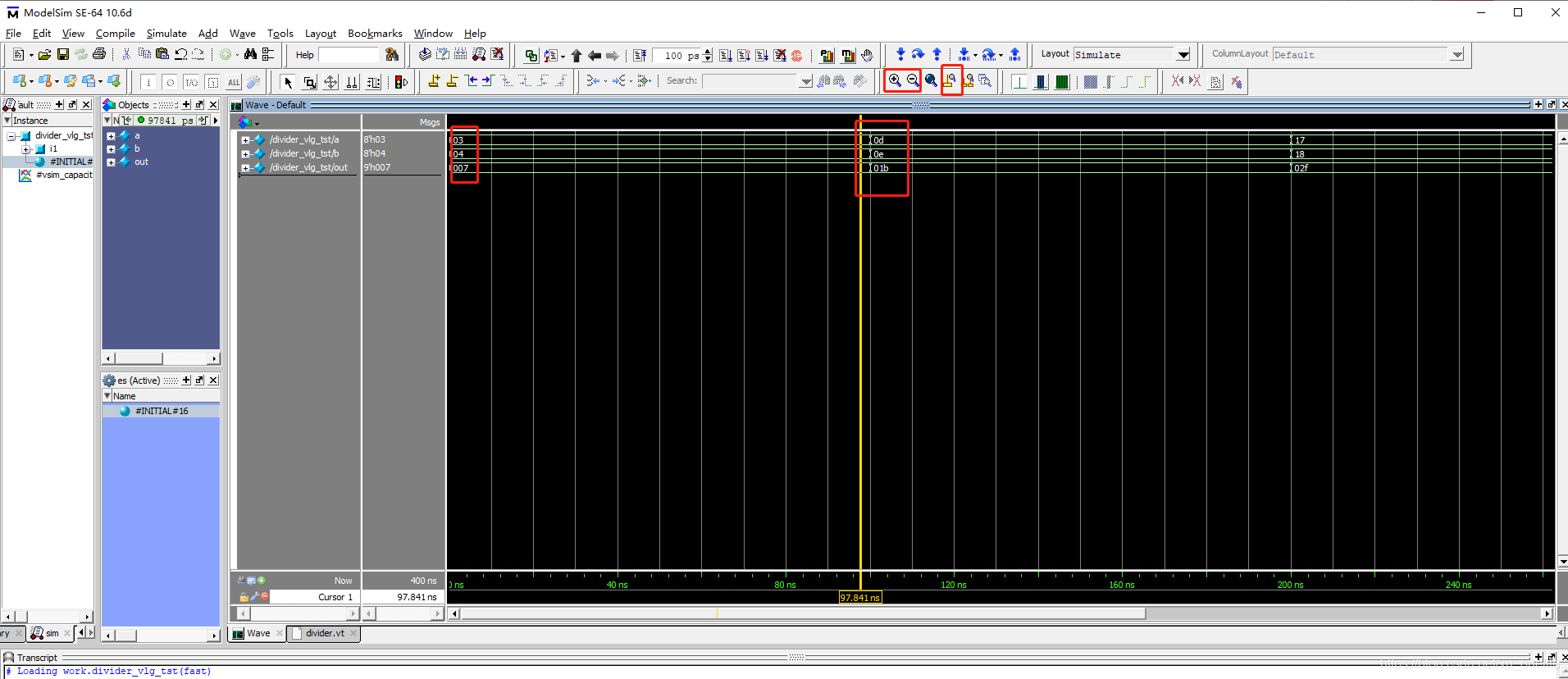 利用放大、缩小查找合适位置查看仿真出来的波形。
