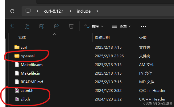 将zlib目录下的zlib.h和zconfig.h头文件全部拷贝到curl-8.12.1\include