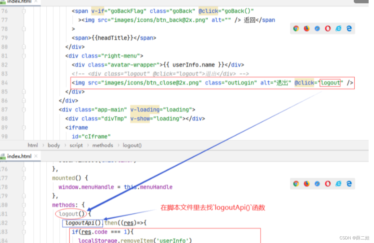 退出按钮绑定的单击事件处理函数logout()