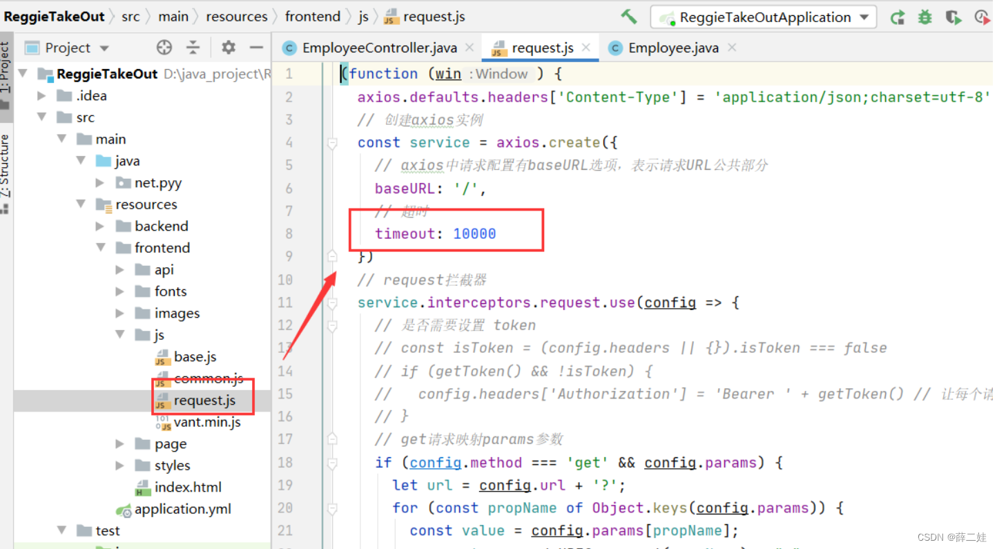 在resources/backend/js/request.js文件里设置超时为1000000毫秒,便于后面做断点调试