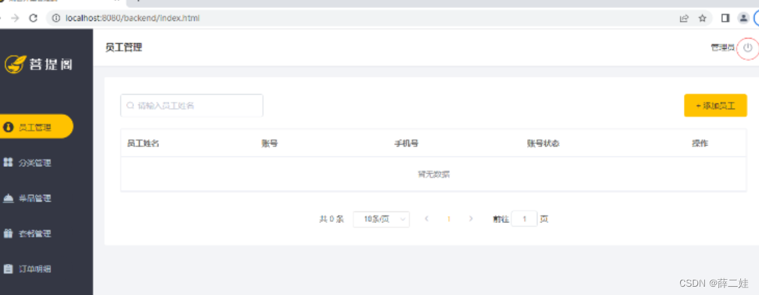 员工登录成功后,页面跳转到后台系统首页面,此时会显示当前登录用户的姓名: