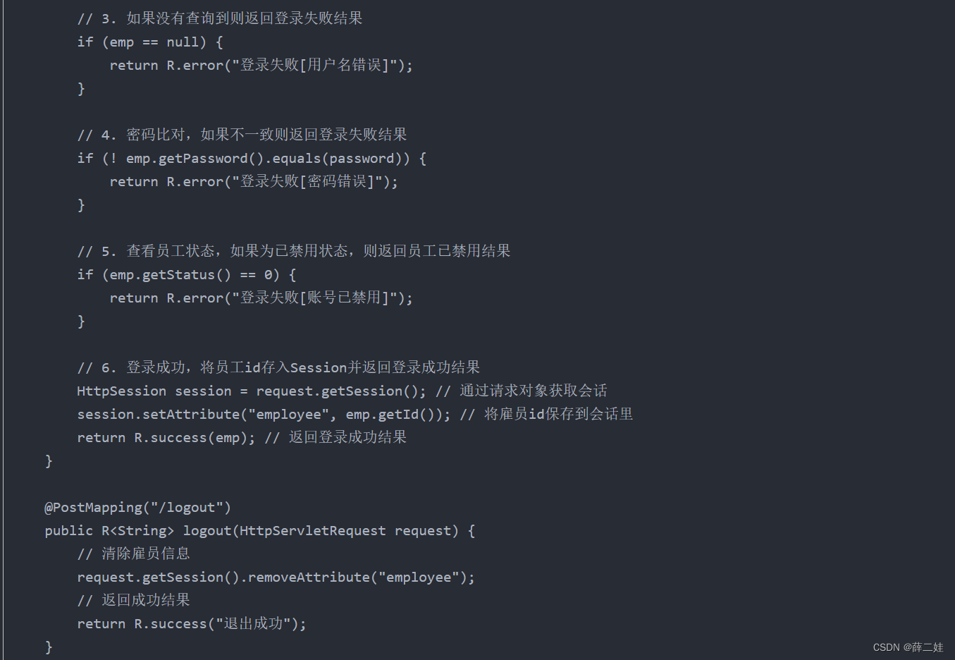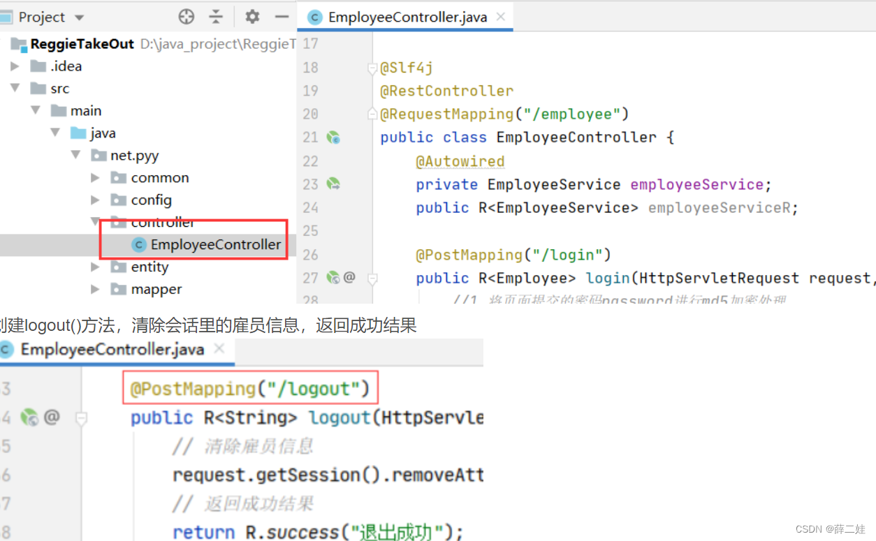创建logout()方法,清除会话里的雇员信息,返回成功结果