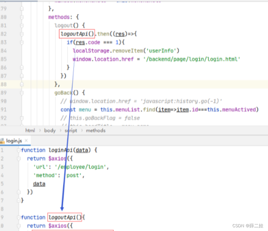 在脚本文件/backend/api/login.js里查看logoutApi()函数