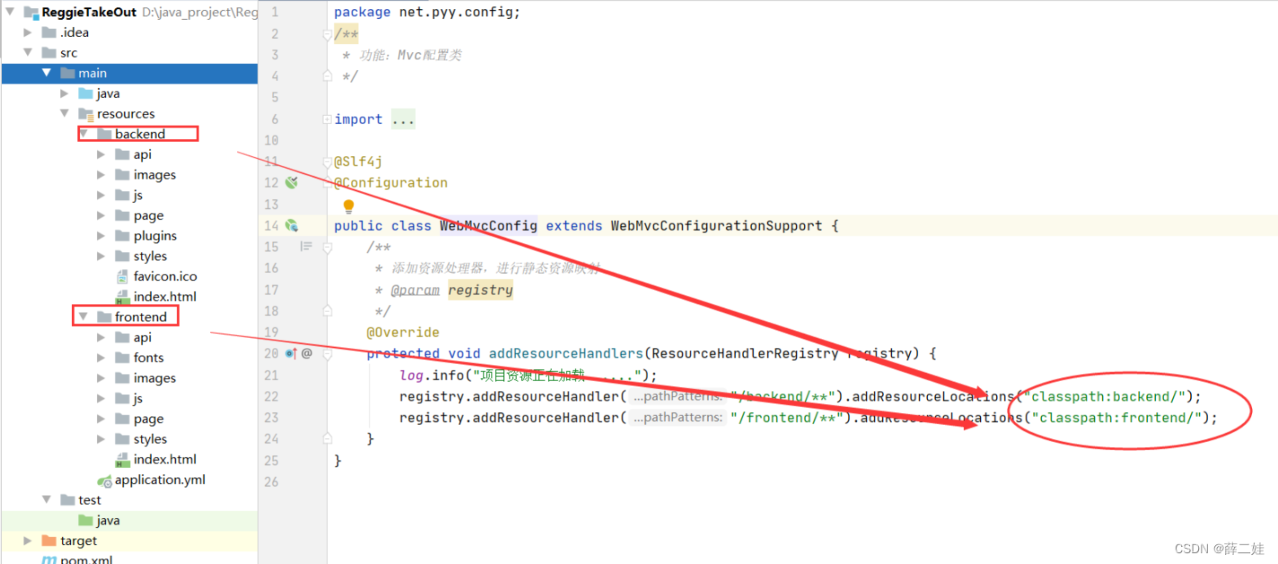 在方法里,添加两个资源映射:映射到前端和后端的静态资源