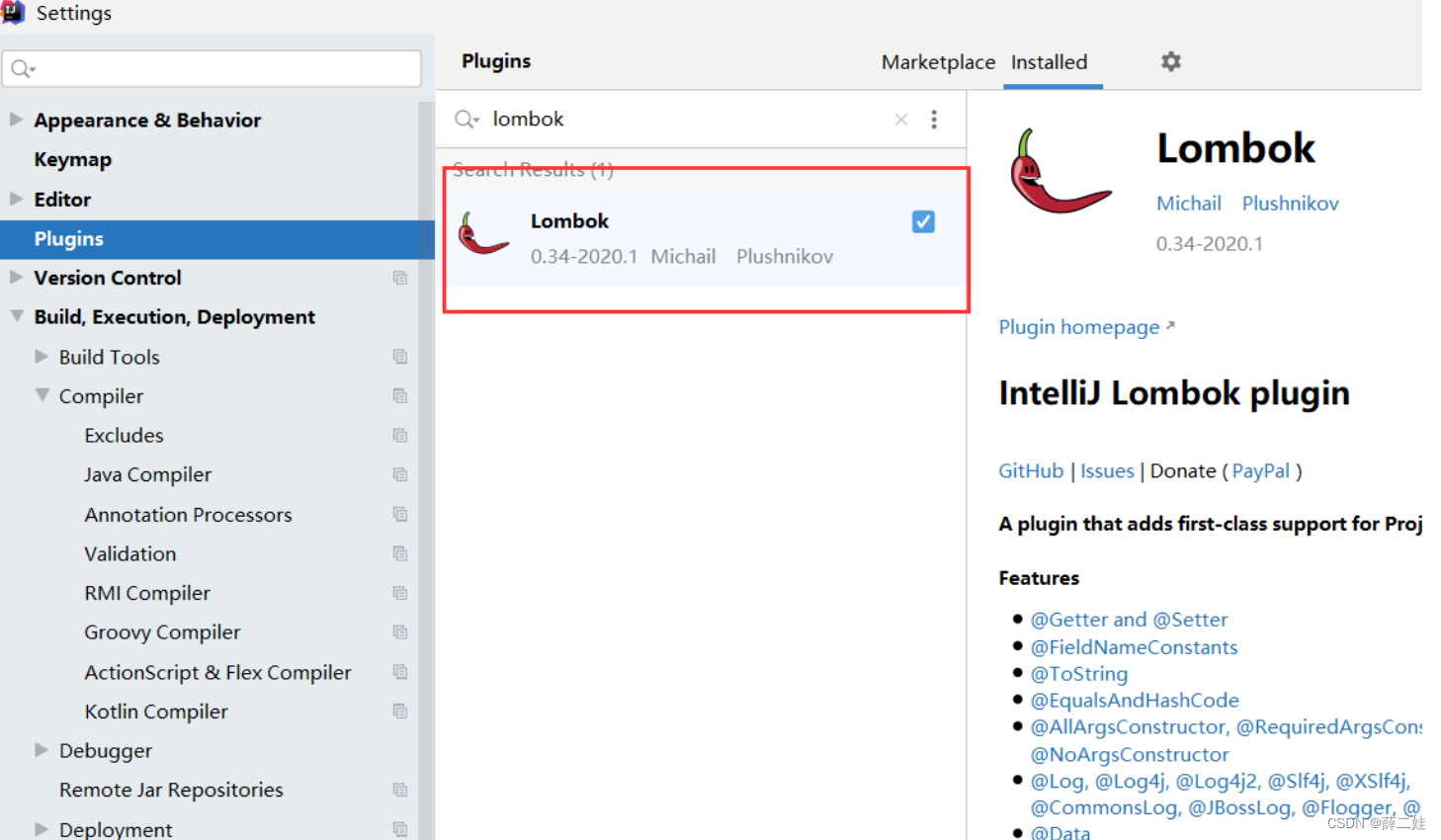 在设置对话框里找到plugins,搜索lombok,单击绿色的Install按钮