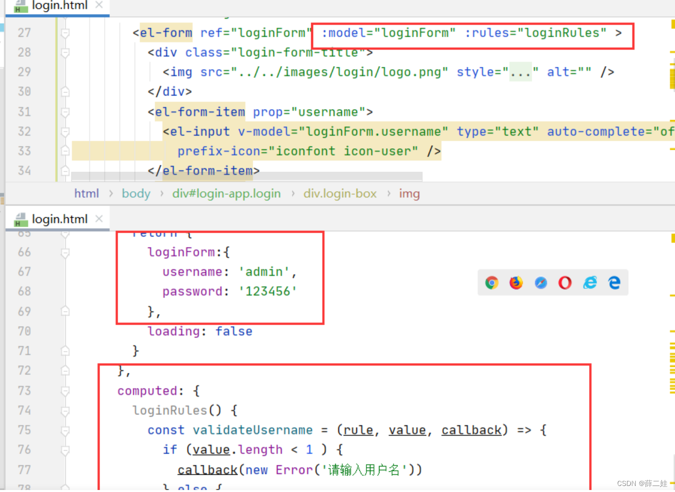 Vue对象通过data()方法绑定JSON数据loginForm,通过computed绑定校验规则loginRules