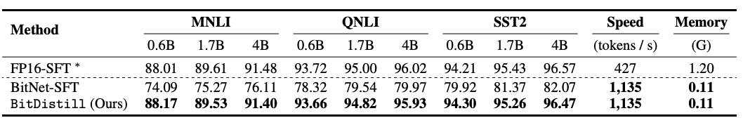 BitDistill展示出在多个下游任务中几乎等同于全精度模型的表现,同时显著降低了内存开销并提升了推理速度。作者在两个典型任务类型上进行了全面实验,分别是文本分类与文本摘要。